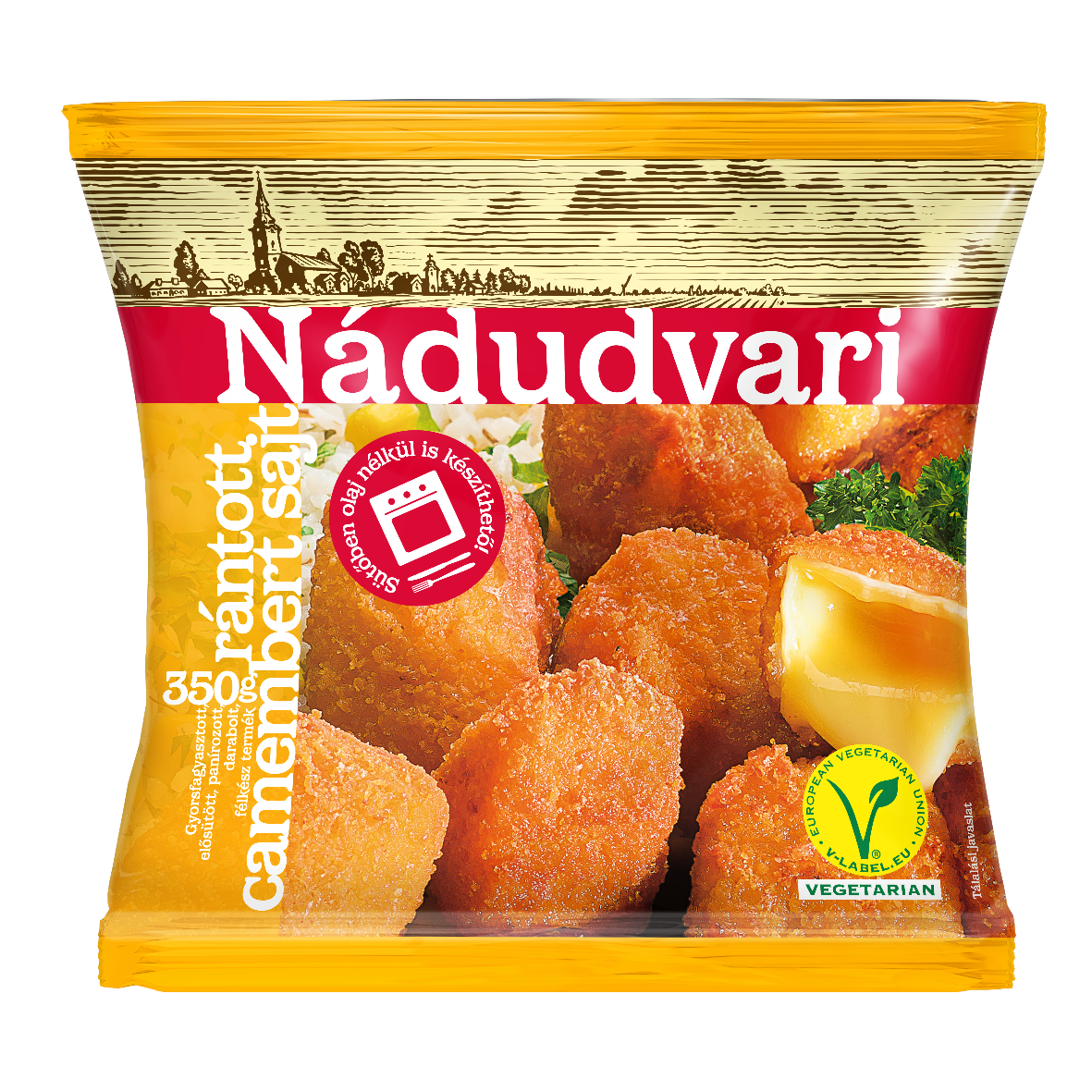 Összetevők: camembert sajt 50% (pasztőrözött, tehéntej, étkezési só, tejfehérje, kultúra, oltóenzim, camembert kultúra), panírmorzsa [búzaliszt, ivóvíz, élesztő, étkezési só, színezékek (paprika kivonat, karotin)], ivóvíz, növényi olajok (napraforgó, repce), étkezési só